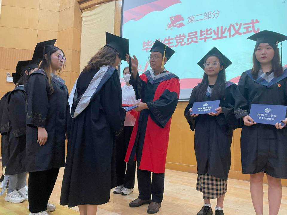 宣誓仪式结束,全体毕业生党员依次上台,宁立伟同志为他们一一拨穗、正冠、颁发学位证并向他们表示真切的祝贺。毕业生党员们通过庄严隆重的仪式与董事长亲切接触,使得他们在离校前充分感受到母校的温暖与关怀,增进他们对母校的认同感。