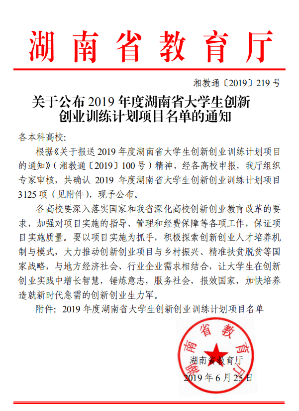 湖南省教育厅6月25日发布“湘教通〔2019〕219号 关于公布2019年度湖南省老员工创新创业训练计划项目名单的通知”,公司数学16-2BS员工李敏同学申报的“基于学习动机理论的微课教学资源设计与应用研究”(项目指导老师丁卫平)和数学17-1BS员工李喆同学申报的“基于 GAP 系统的 n -立方代数的结构与表示研究”(项目指导老师罗德仁)获得立项。