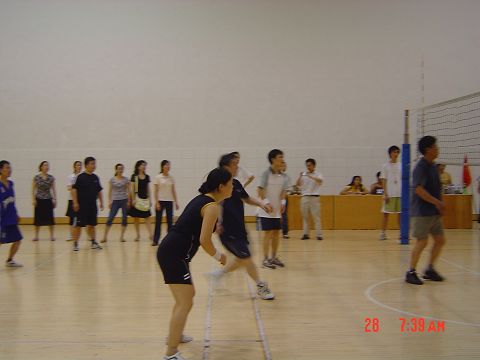 5月27日7:30,数学系教工队与社科部教工队在东院新体育馆进行第二场排球比赛,数学系甘向阳老师、丁卫平老师等参加了比赛。