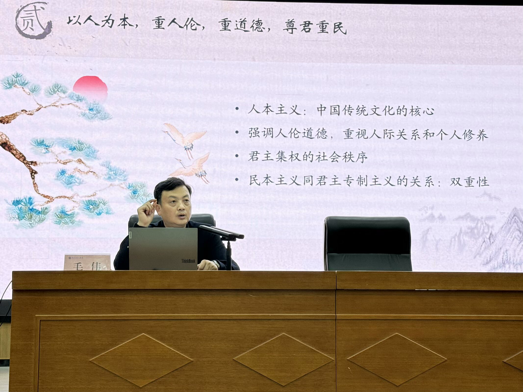 讲座中,毛伟以“探索中国传统文化的特点”为核心,借助国学经典作品、历史人物和历史事件,详细阐述了中国传统文化的八大特征。他指出,湖理学子应当孜孜不倦地探索中国传统文化的深厚底蕴,从中不断汲取精神力量,以便更好地追寻自己的理想信念。紧接着,毛伟向新生传达了八点重要思想,其中,“天行健,君子以自强不息”的精神和“富贵不能淫,贫贱不能移,威武不能屈”的坚韧品质,让新生们受益匪浅。最后,毛伟鼓励同学们多读文化经典著作,感受文字的魅力,领会古人的智慧,并将从中领悟到的真理应用到现实生活中去。