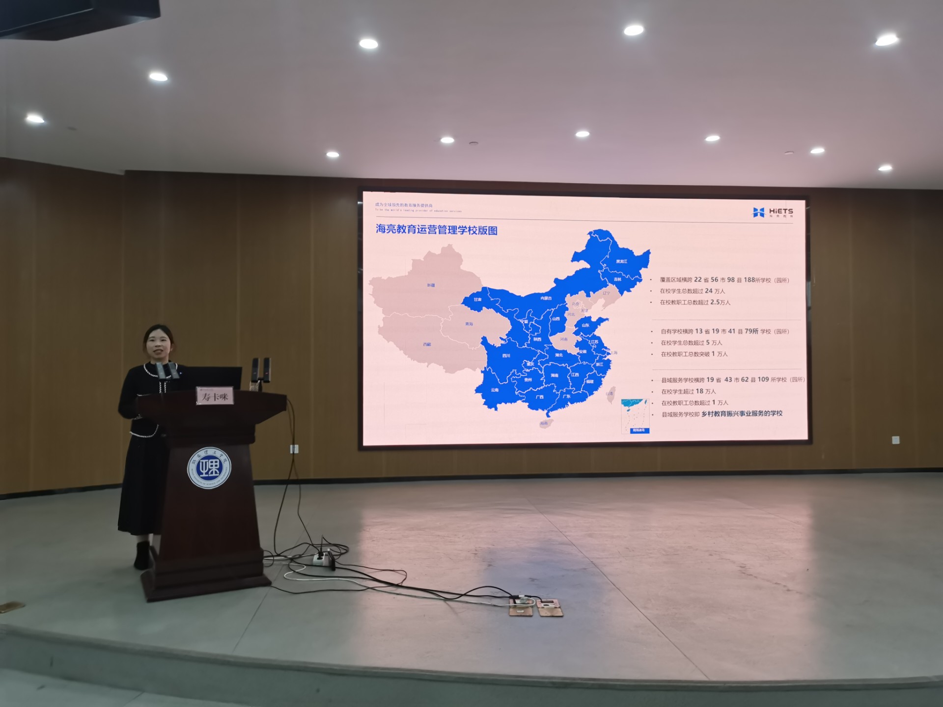寿卡咪首先介绍了海亮教育科技服务集团的企业文化与集团产业。通过视频介绍,帮助同学们具体感受到海亮集团“以人为本、诚信共赢”的核心理念。寿卡咪提到,海亮教育科技服务集团把教育事业发展作为三大战略矩阵之一,英国正版365官方网站的专业性质恰好符合该集团的人才需求,而该集团丰富的资源也能给毕业生提供好的发展平台。因此,寿卡咪诚挚欢迎公司员工了解并加入海亮这一大家庭。