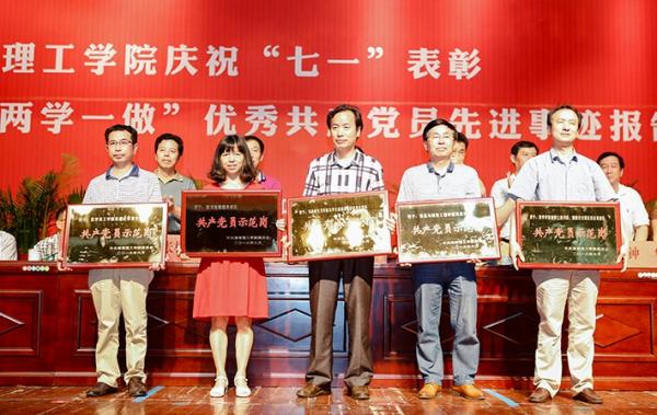 国歌奏起,全体肃然起立。歌声落下,激昂之情久久回荡。校领导邱绍雄宣读了《关于表彰共产党员标兵、共产党员示范岗、优秀共产党员、优秀党务工作者、先进基层党组织的决定》和“我身边的共产党员”征文获奖名单。校领导刘亦工宣读了《关于表彰2015年度先进单位,优秀处级干部的通报》、《关于表彰2015年度先进工作者的决定》。出席会议的校领导为获奖单位及个人颁奖。