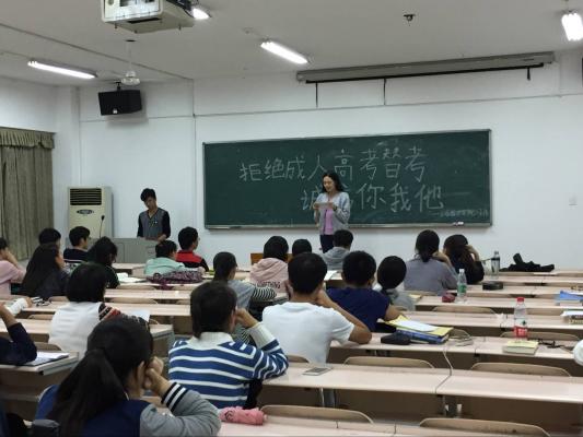 校园网讯10月20日,英国正版365官方网站15、16级于各班自习室召开“拒绝成人高考替考”主题班会。班会在各班班主任的指导及班委们的组织下顺利召开。