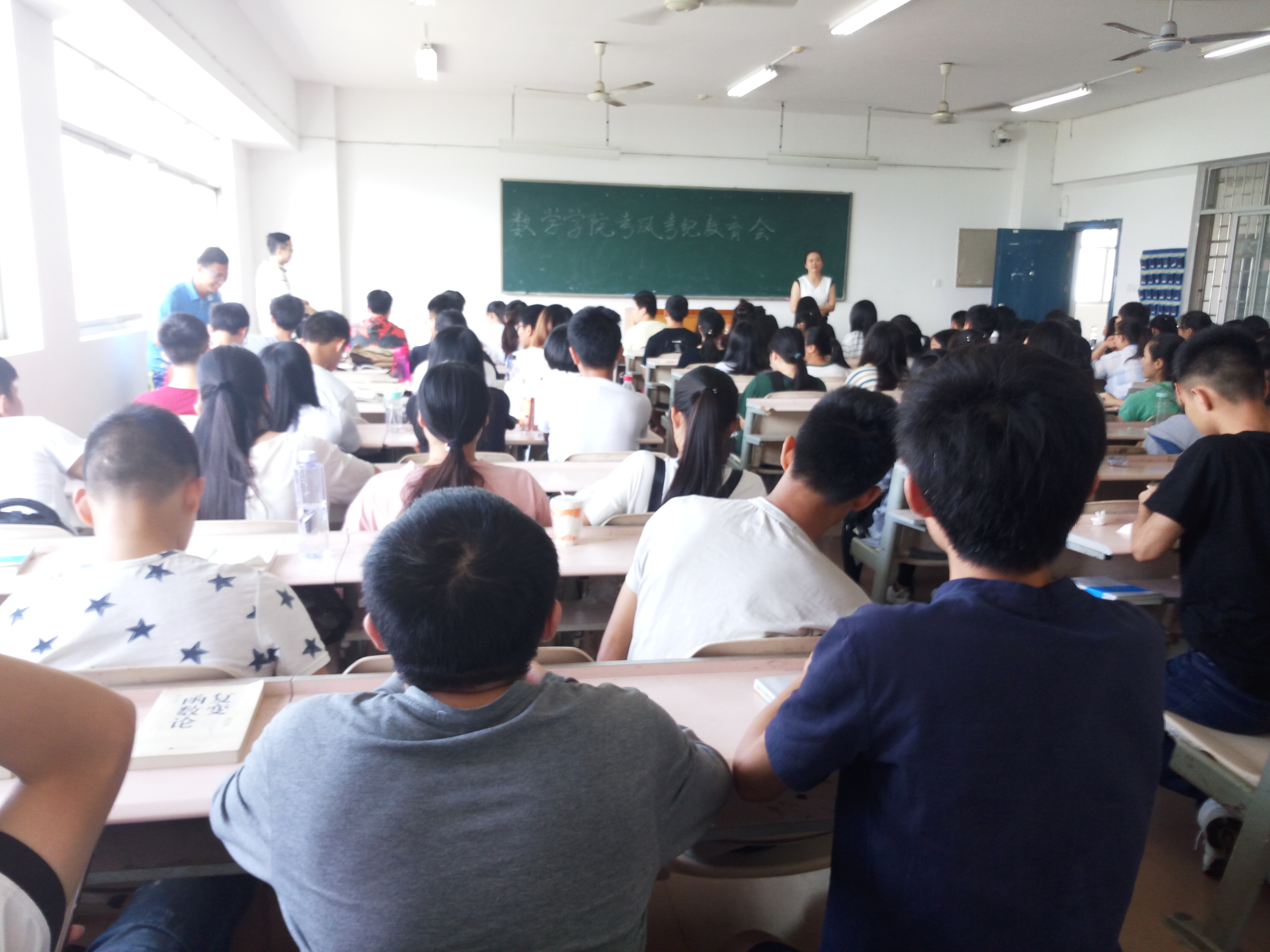 本站讯 6月6日和6月7日,英国正版365官方网站15级分专业分别在5304和5504教室教室召开考风考纪教育会,15级辅导员傅丹作为本次会议的主讲人。