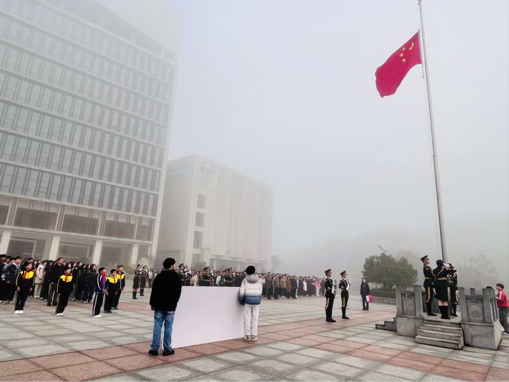 国歌嘹亮,国旗飘扬。国旗护卫队迈着矫健整齐的步伐走向升旗台。随着国旗冉冉升起,全体师生庄严肃立行注目礼,高唱国歌。