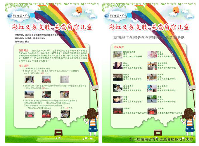 除此之外,彩虹志愿者服务队曾前往过岳阳市福利院开展长达一学期的关爱残疾儿童活动和福利院老年人活动中心的墙绘活动。近期在坚持蔡家小学义务支教活动时,彩虹志愿者还为南湖学院工程系和本部土建学院的大一生,重修生进行针对性的数学义务辅导。